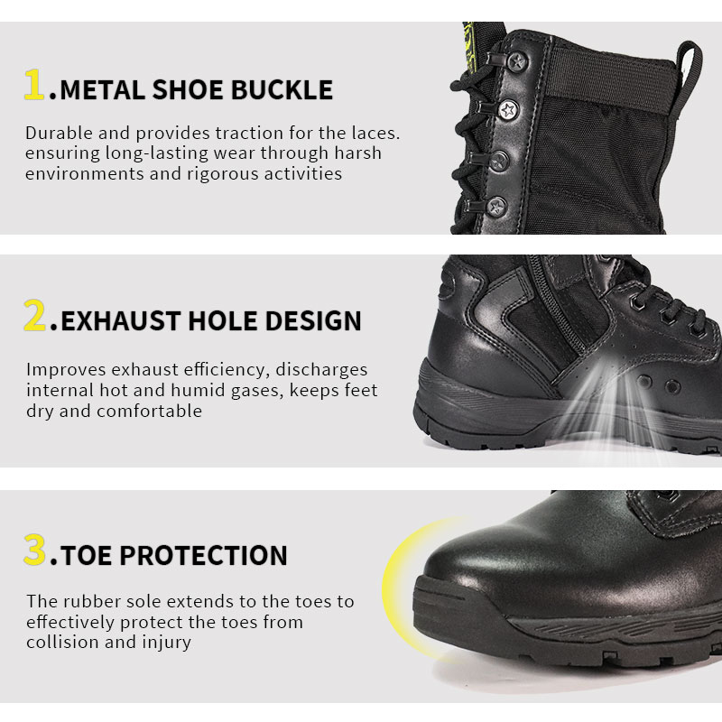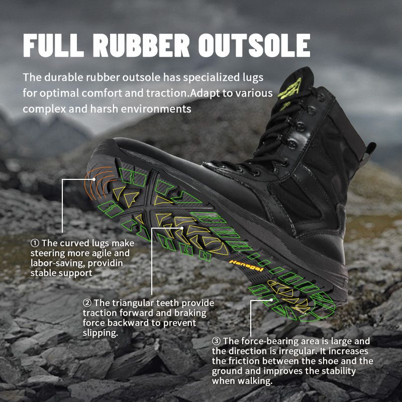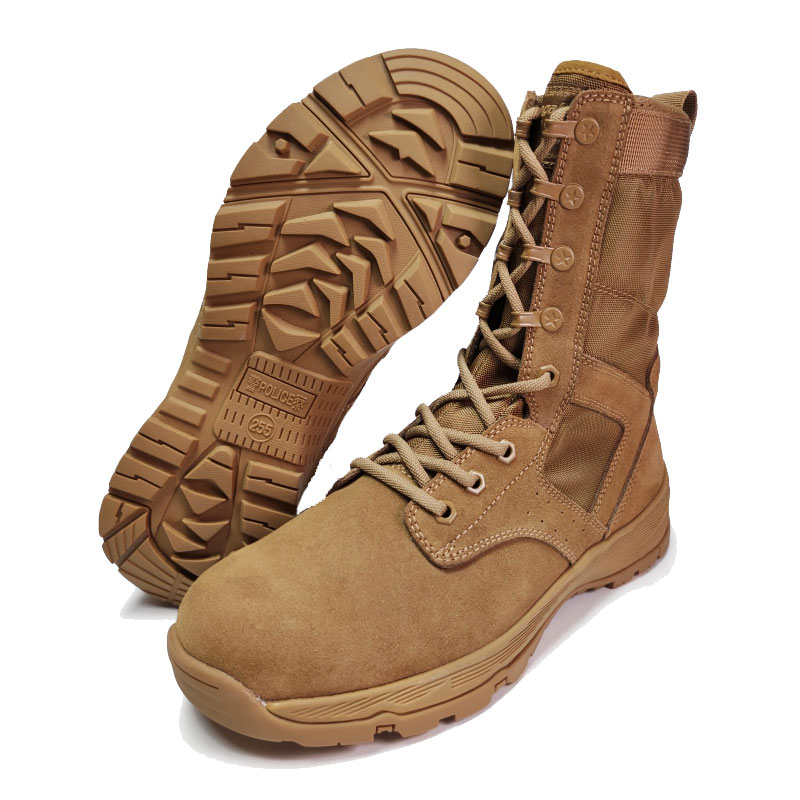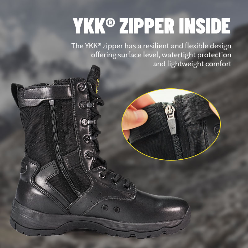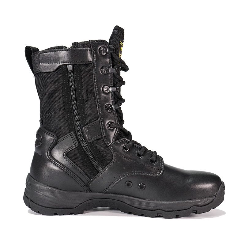 A katonai személyzet és a szabadtéri szerelmesek számára készült Full Rubber Outsole Police Boots kényelmes, körülölelő illeszkedést és komoly stabilitást kínál durva terepen. A recézett nyelv távol tartja a törmeléket és középen marad, míg a tartós velúr és nejlon felsőrész ellenáll a nehéz körülményeknek is. Az YKK cipzár megkönnyíti a fel- és levételt, így továbbra is az előttünk álló küldetésre összpontosíthat.