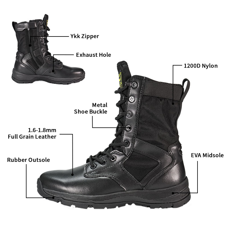 Ezek a teljes gumitalpú rendőrcsizmák raktáron vannak, és készen állnak a szállításra, mindössze 10 pártól kezdve. További részletekért vagy árakkal kapcsolatos kérdésekért forduljon bizalommal bármikor. A testreszabás is elérhető minimum 800 páros megrendeléssel. Ennek a modellnek a következő előnyei vannak: